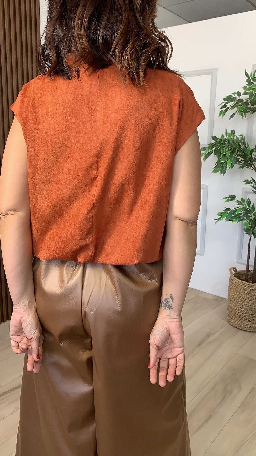 Make a statement with the Acuerdo Top, an elegant rust suede piece that effortlessly transitions from day to night. The graceful cowl silhouette drapes beautifully while short sleeves provide breathable comfort. An innovative bubble design creates visual interest and texture, while the elastic waistband offers flexibility and ease of movement. This versatile tunic is the sophisticated addition your wardrobe has been waiting for.