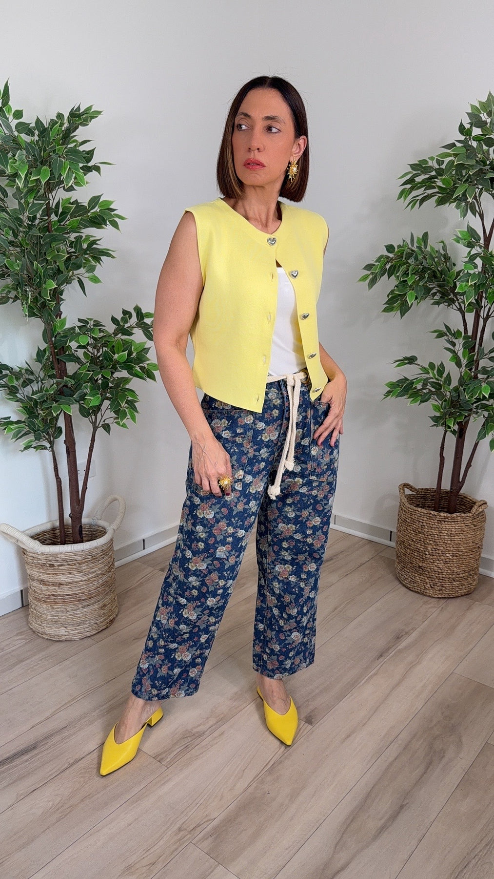 Elevate your wardrobe with the Dignity Butter Yellow Vest, a charming short-sleeve sweater that combines elegance with everyday comfort. Featuring a delightful heart-shaped button detail, this piece brings a touch of sophistication and warmth to any outfit. The soft, luxurious fabric drapes beautifully while maintaining its shape, making it perfect for layering or wearing solo. Whether you're dressing up for a special occasion or adding polish to casual wear, this butter yellow vest is a versatile essential that transitions seamlessly through seasons.