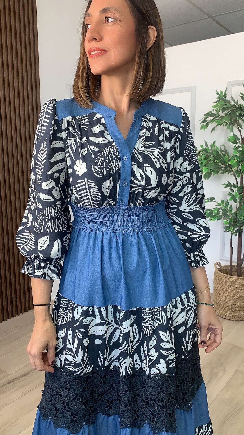 Discover the Emerger Denim Midi, a stunning tiered woven dress that effortlessly blends style and comfort. Featuring delicate leaf-printed accents and a charming chambray denim contrast, this piece offers visual interest from every angle. The smocked waist provides a flattering silhouette while ensuring all-day wearability. Perfect for transitional seasons, this midi dress works beautifully for casual outings or dressed-up occasions.