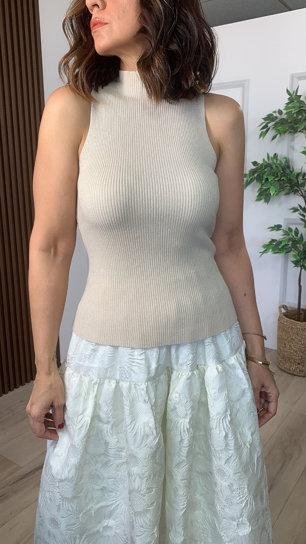 The Esencia Top combines elegance and sparkle with its sleeveless design and glittery mock neck, perfect for making a stylish statement. Crafted for comfort and eye-catching appeal, this sweater top elevates any outfit with a touch of shimmer, ideal for both day and night occasions.