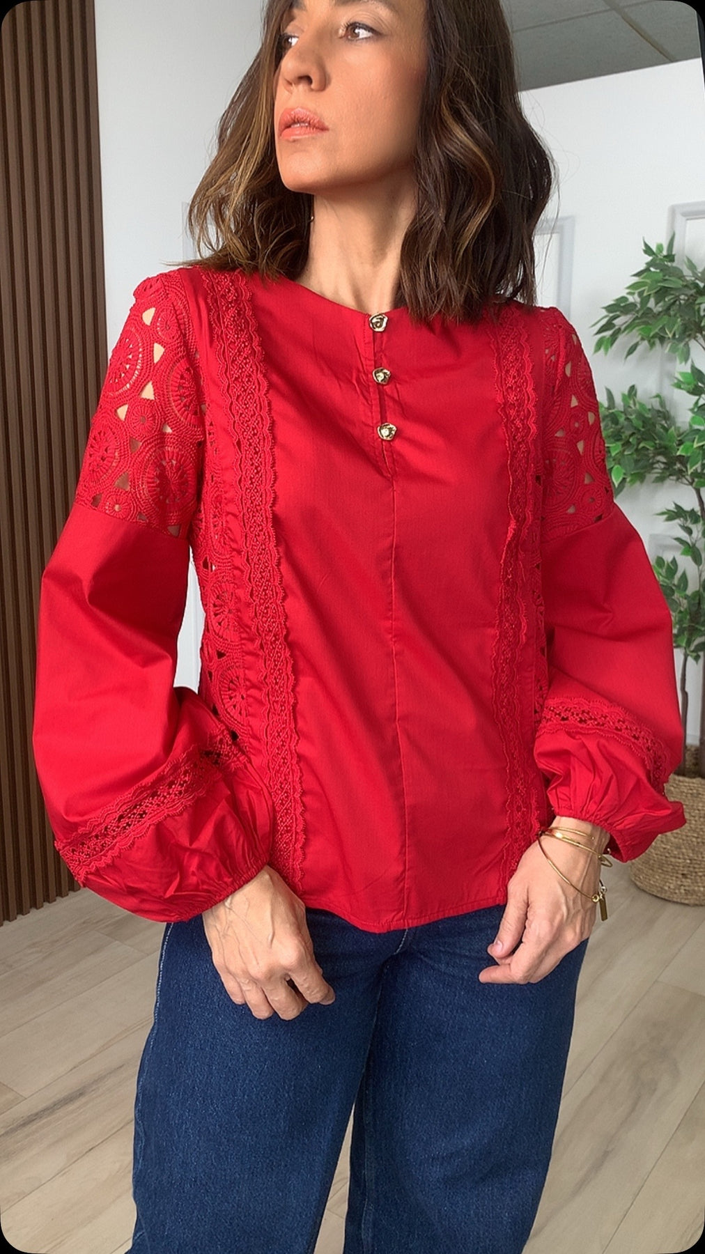 The Esfuerzo Red Blouse combines vibrant red cotton fabric with delicate lace detailing on the sleeves, creating a perfect blend of comfort and sophistication. Its breathable material ensures all-day ease, while the lace adds a touch of elegance that elevates your outfit for any occasion. Ideal for those who want to stand out with a stylish yet comfortable top, this blouse is a versatile addition to your wardrobe.