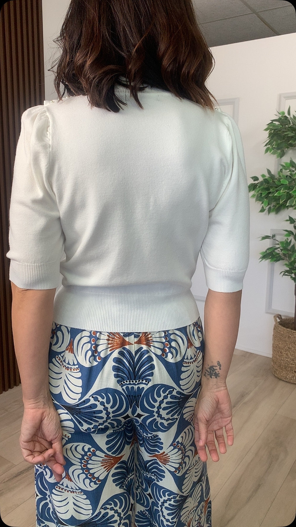 The Estación Top is a sophisticated addition to any wardrobe, designed to effortlessly enhance your outfit. Crafted in a soft ivory hue, this sweater showcases short puff sleeves that bring a charming volume and shape. The sleeves are beautifully embellished with delicate pearl details, offering a refined and feminine touch that catches the eye. Perfect for both casual and dressier occasions, the Estación Top combines comfort with elegance, making it an ideal choice for those seeking a stylish yet versatile piece. Experience timeless beauty and effortless chic with this standout sweater.