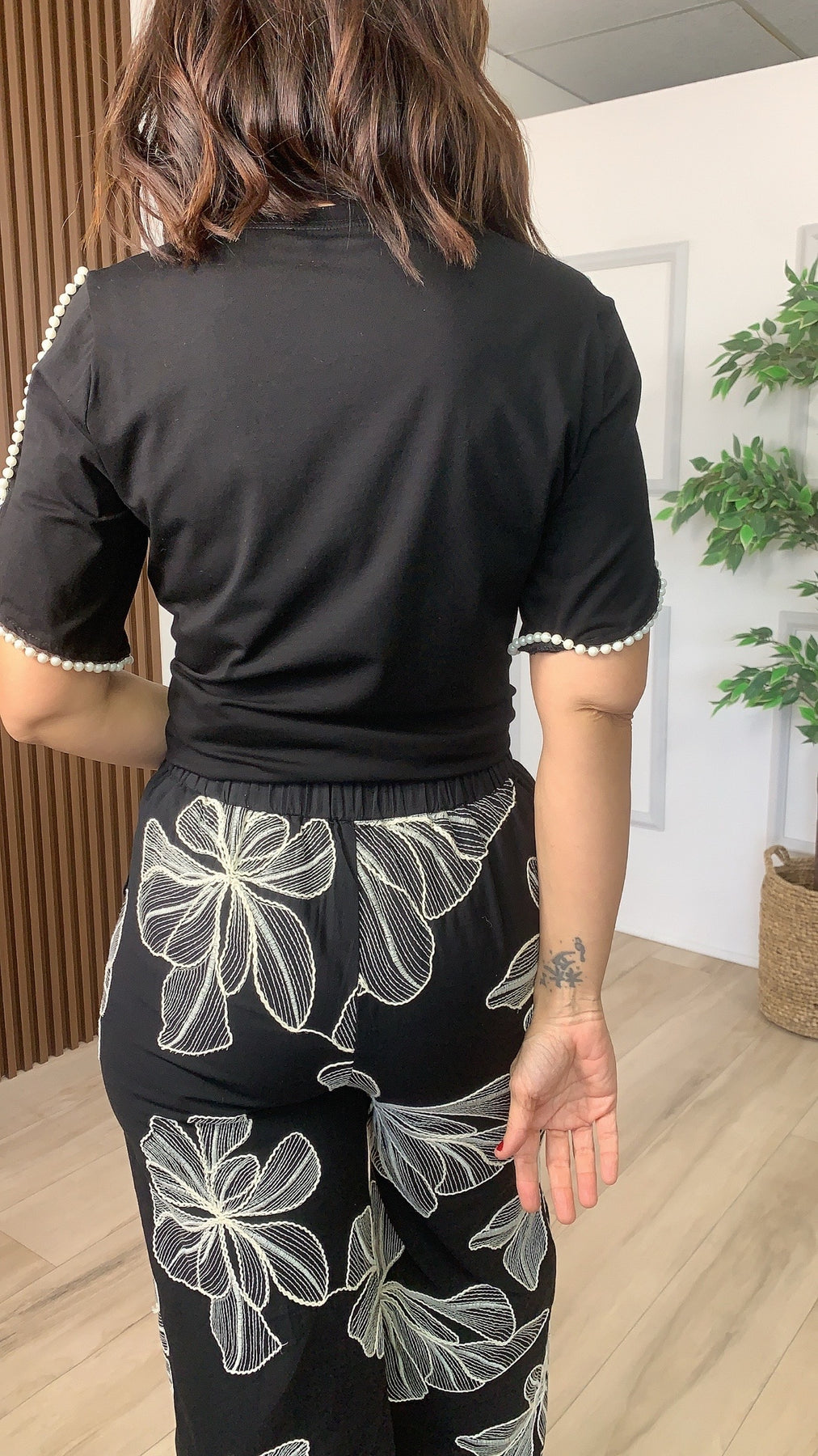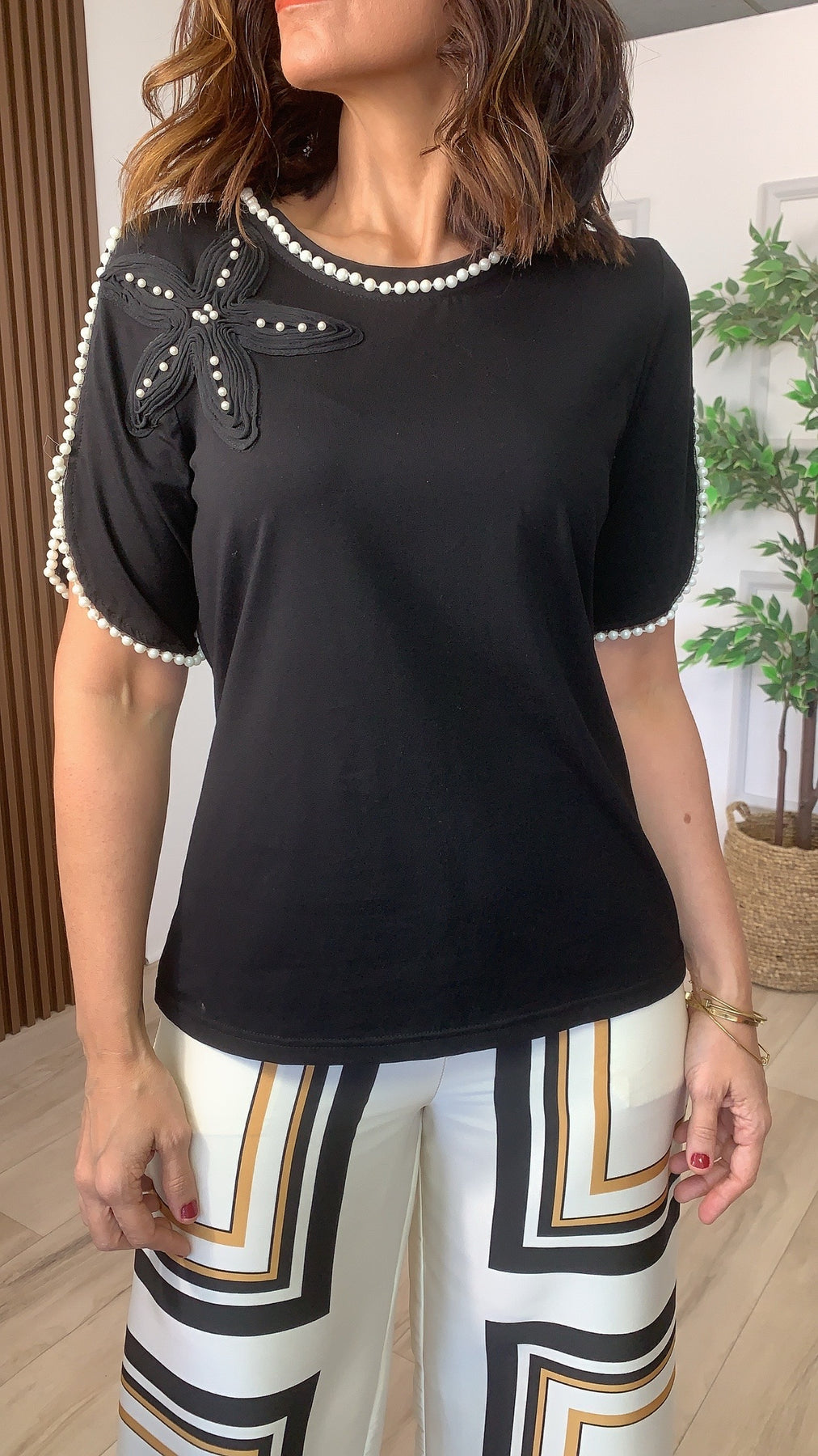 Elevate your everyday wardrobe with the Fértil Black Top, a sophisticated tee that seamlessly blends classic style with refined details. Featuring delicate pearl embellishments and a timeless round neckline, this short-sleeved essential delivers understated elegance for any occasion. Perfect for layering or wearing solo, it's the versatile piece you'll reach for again and again.
