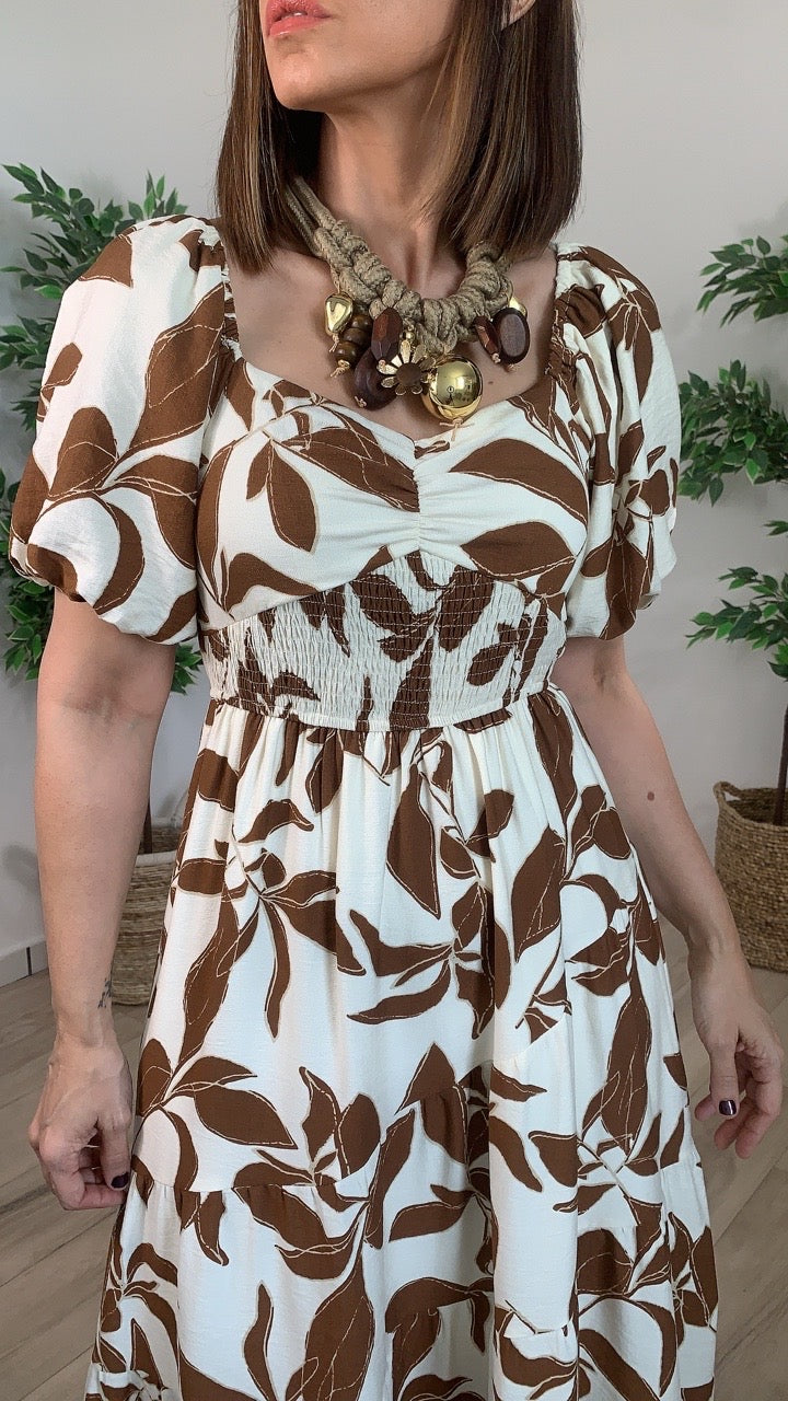 Elevate your wardrobe with the Generoso Midi, a sophisticated tiered dress that combines effortless elegance with flattering silhouettes. The mocha bubble sleeves frame your shoulders beautifully, while the V-neckline creates a refined, elongating effect. A smocked waist cinches your figure for a polished look that transitions seamlessly from day to evening. The cascading tiered skirt adds movement and dimension, making this piece a versatile essential for any occasion.