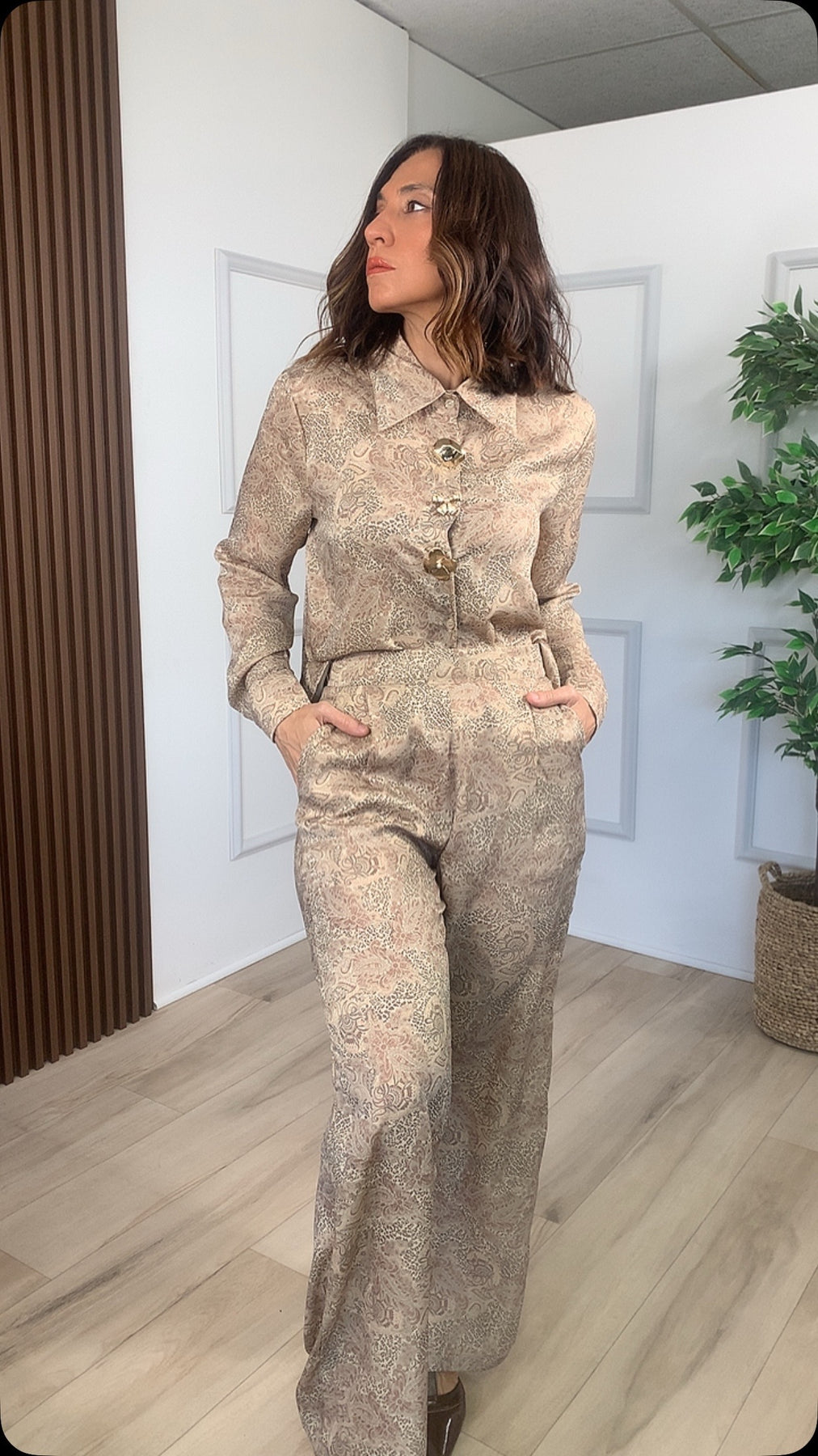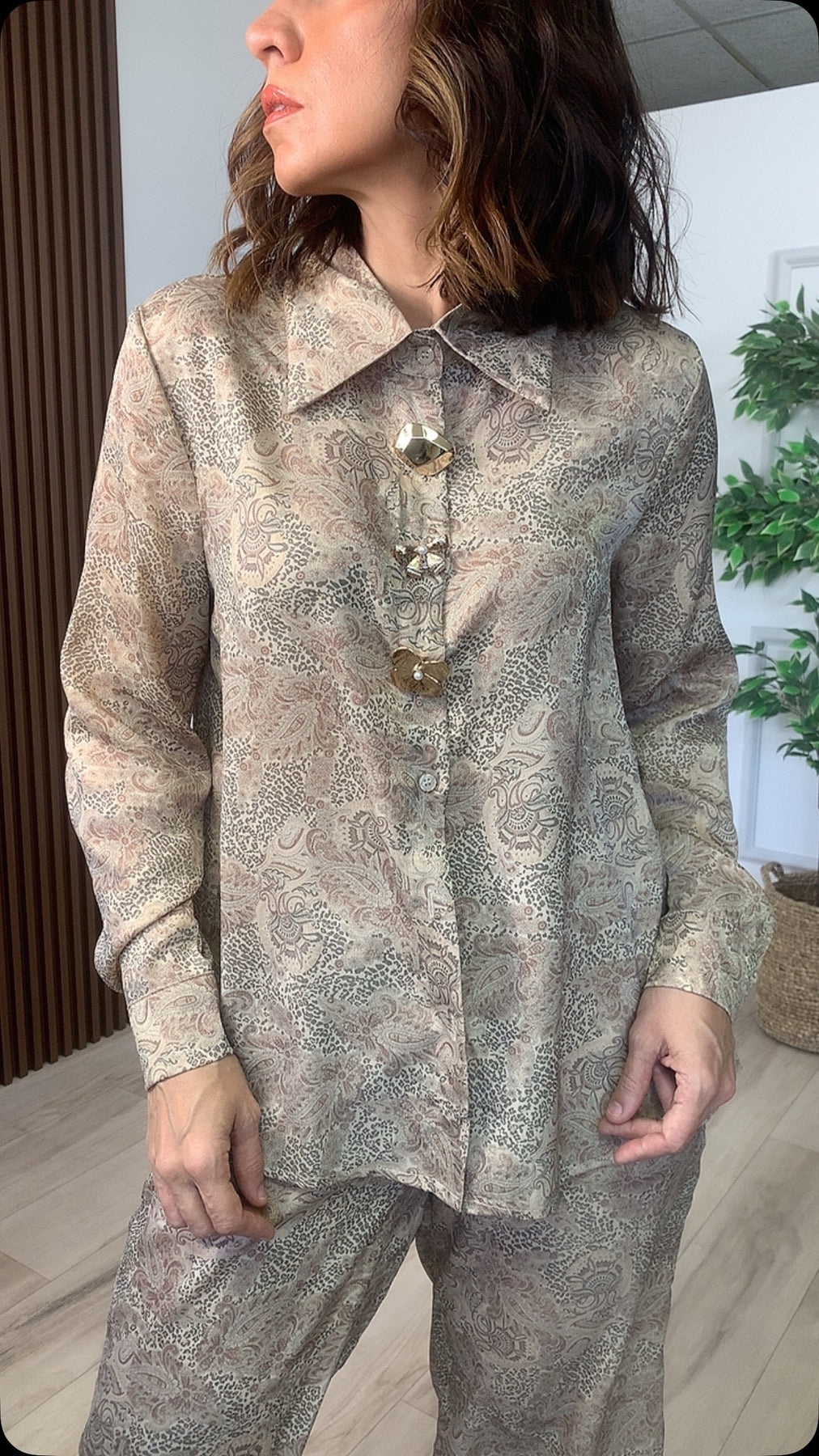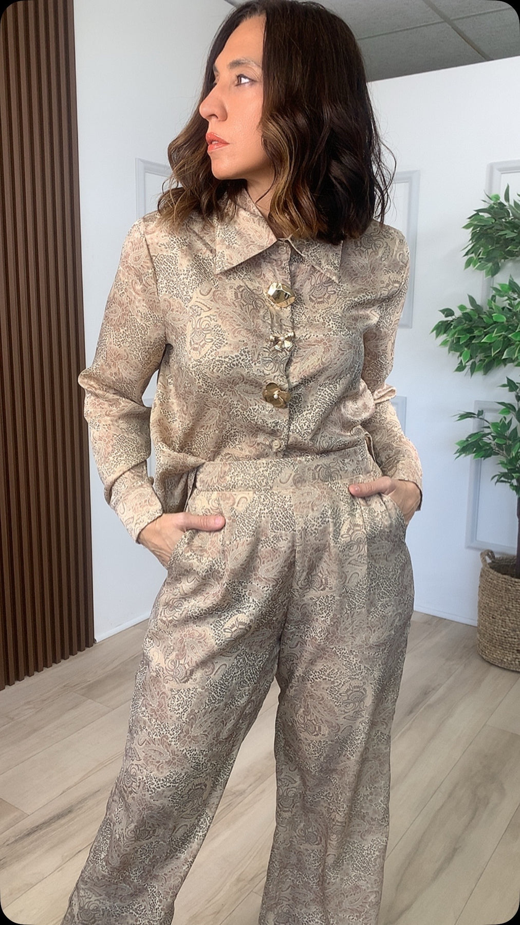 The Ingenio Set offers a striking khaki brocade satin design that elevates your wardrobe with a touch of luxury. The blouse is crafted with a sophisticated collar neckline and long sleeves, providing a refined silhouette perfect for both formal occasions and elegant everyday wear. Gold button accents add a subtle yet eye-catching detail, enhancing the overall aesthetic with a hint of opulence. This set combines timeless style with exquisite craftsmanship, making it a versatile choice that effortlessly transitions from day to night, ensuring you look polished and confident wherever you go.