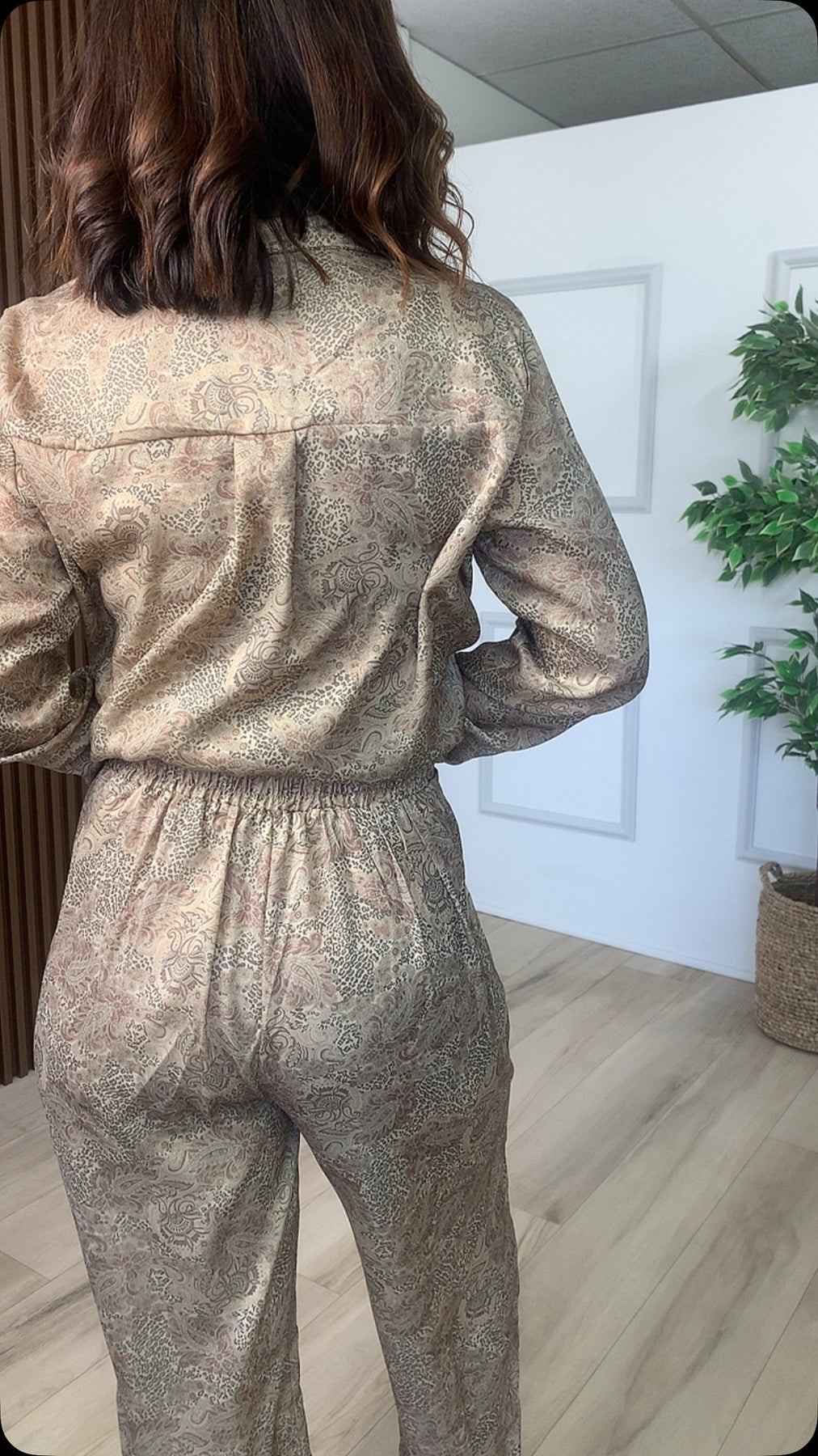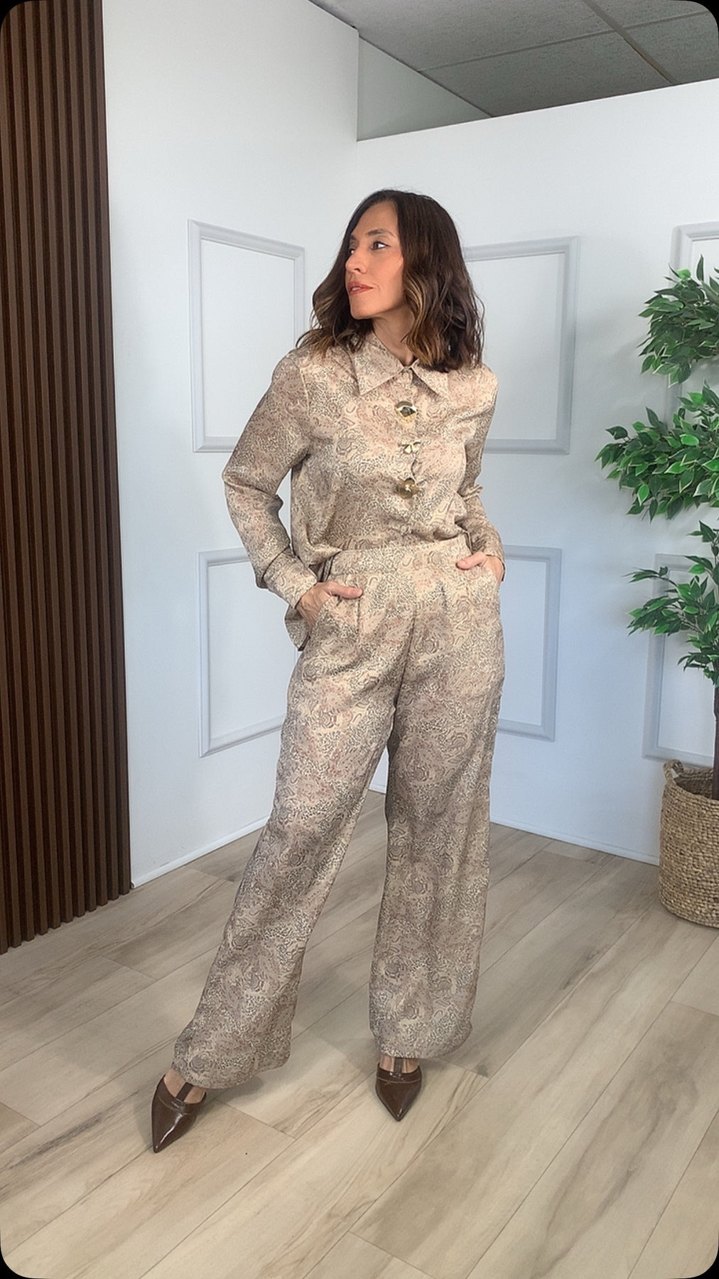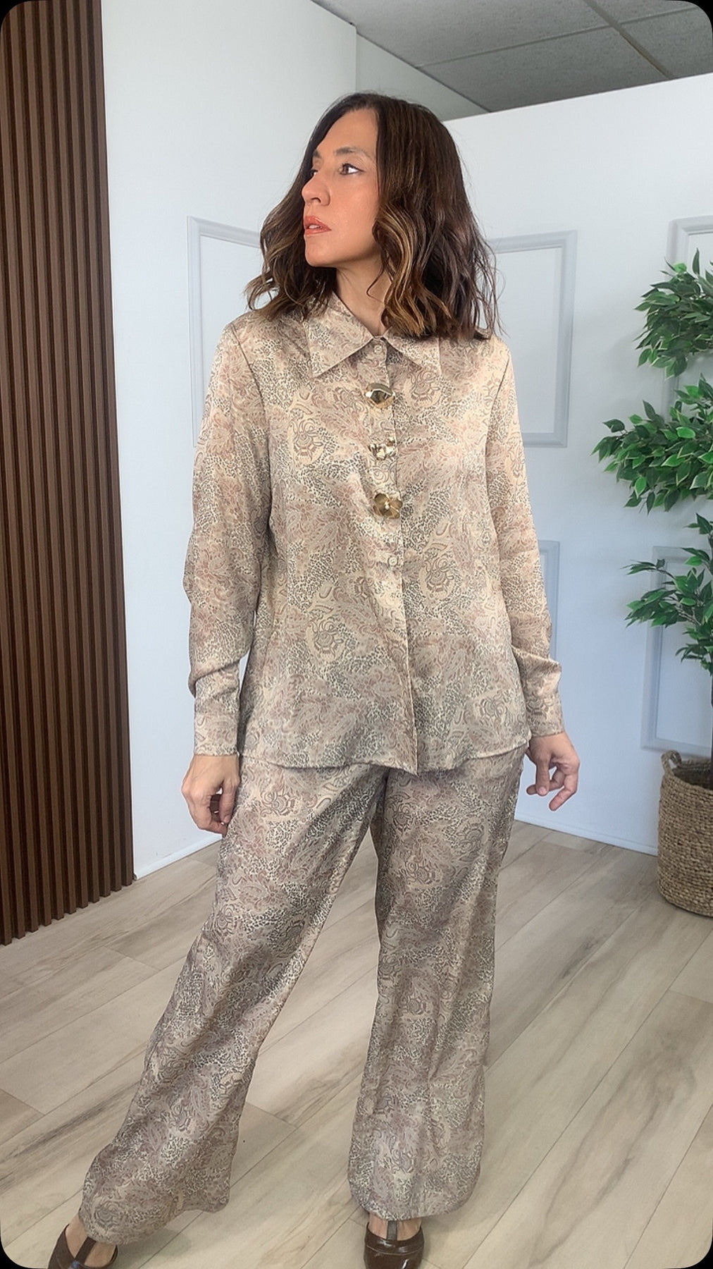 The Ingenio Set offers a striking khaki brocade satin design that elevates your wardrobe with a touch of luxury. The blouse is crafted with a sophisticated collar neckline and long sleeves, providing a refined silhouette perfect for both formal occasions and elegant everyday wear. Gold button accents add a subtle yet eye-catching detail, enhancing the overall aesthetic with a hint of opulence. This set combines timeless style with exquisite craftsmanship, making it a versatile choice that effortlessly transitions from day to night, ensuring you look polished and confident wherever you go.