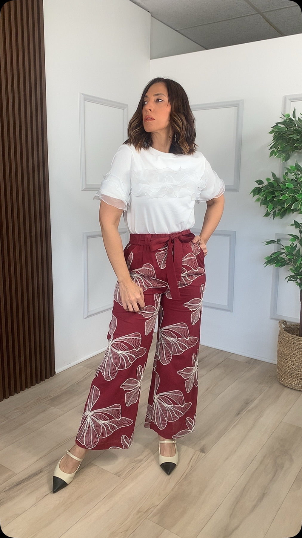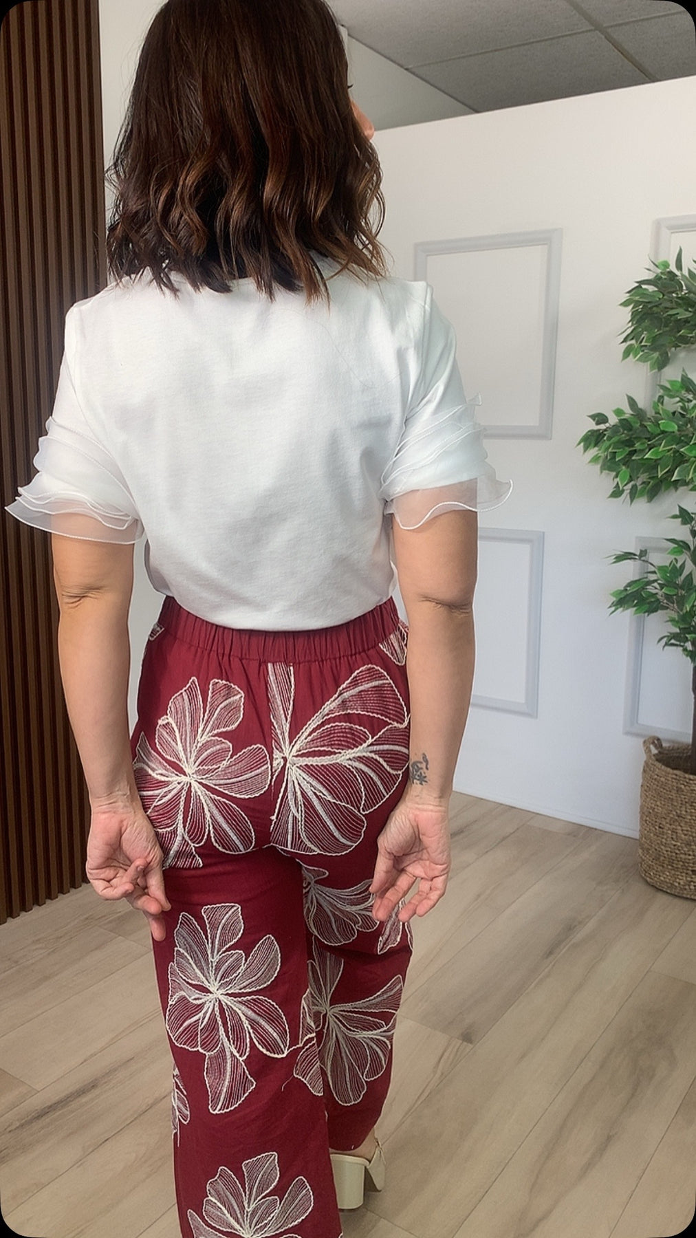 The Lapso Top combines classic comfort with a modern twist, featuring a crisp white-trimmed tee base that enhances its clean and fresh appeal. Delicate organza ruffle details gracefully adorn the front and sleeves, adding a touch of sophistication and movement that makes this piece stand out. Perfect for elevating everyday outfits, this top effortlessly blends elegance with casual style, making it an essential addition to your wardrobe for both day and evening occasions.