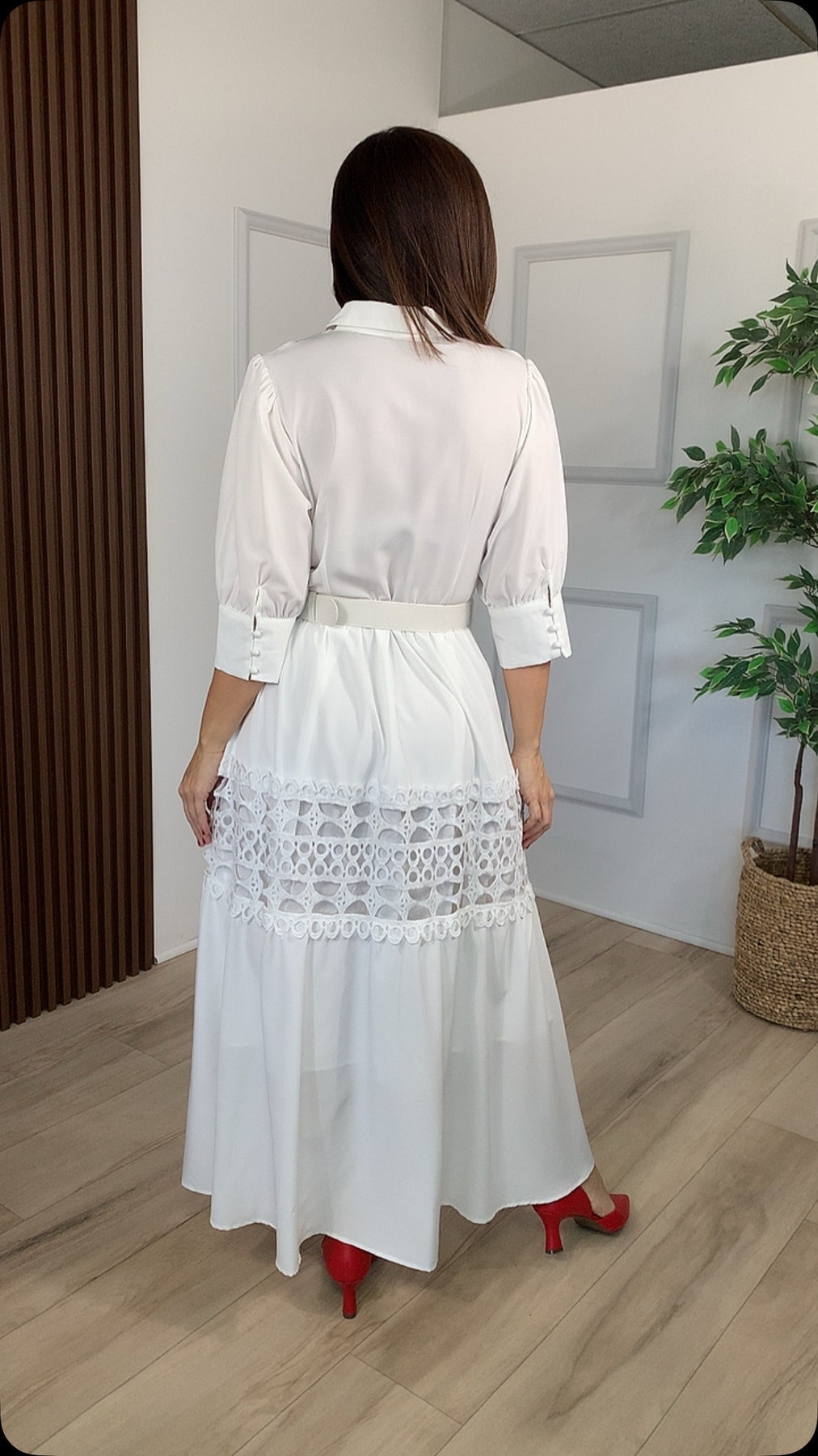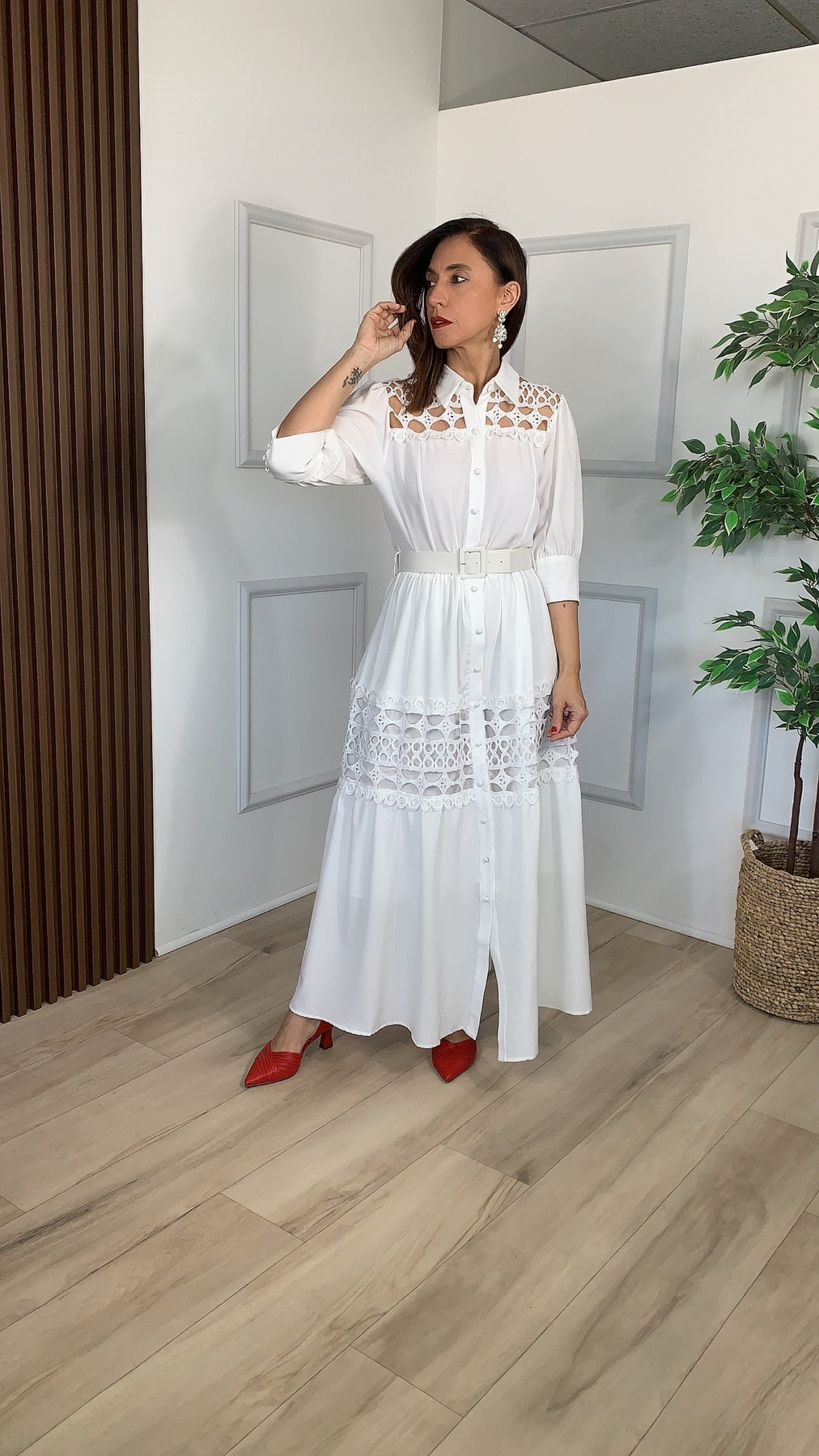 Discover timeless elegance with the Pacto Maxi, a sophisticated crochet dress that effortlessly transitions from day to evening. This contemporary design features a flattering belted silhouette with a convenient button-down front and stretch waistband for all-day comfort. The half-sleeve cut and delicate pleated crochet trim add refined details, while the interior lining and quality fabric ensure a polished, luxurious feel. Perfect for those seeking understated style with enduring appeal.