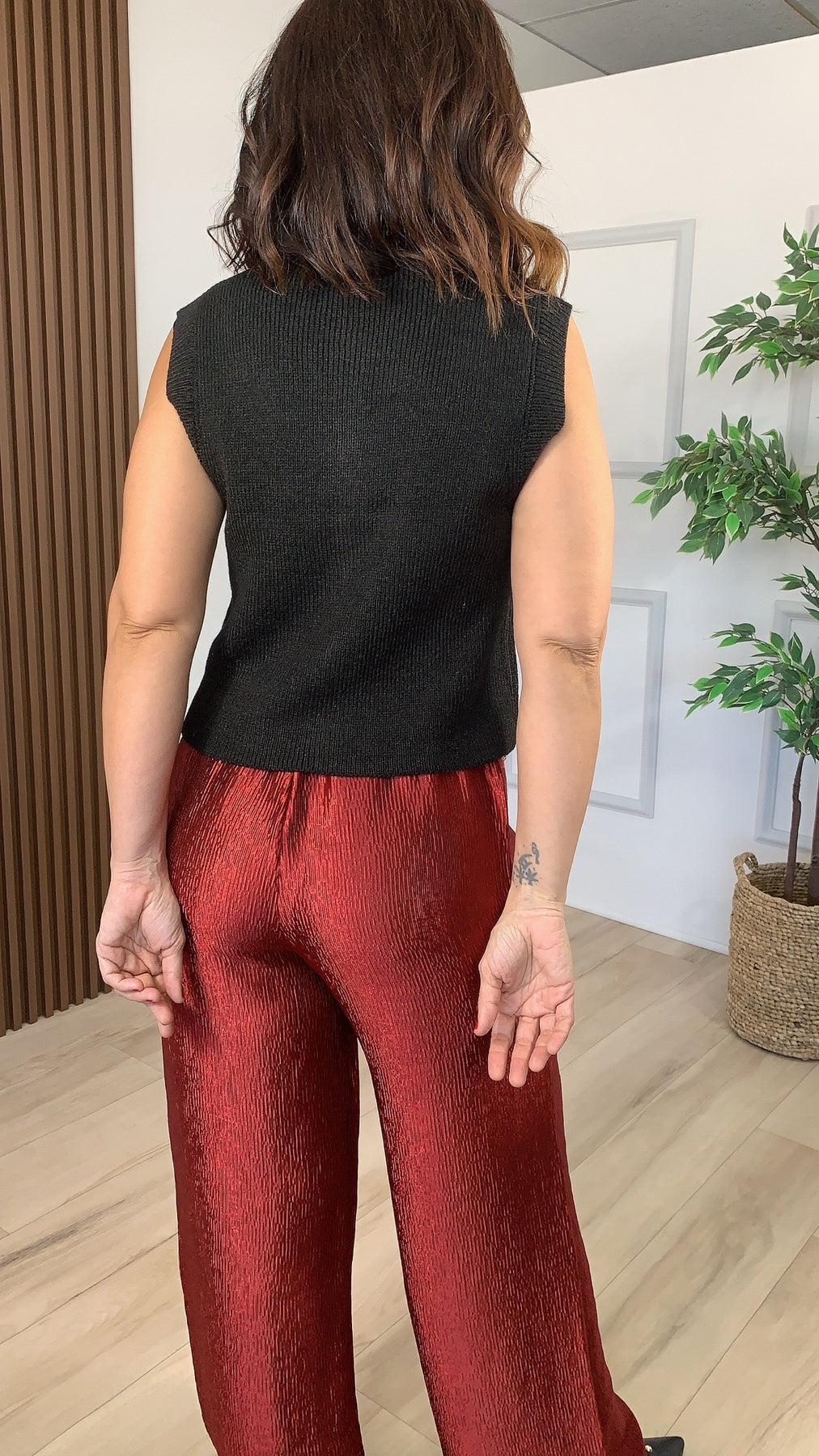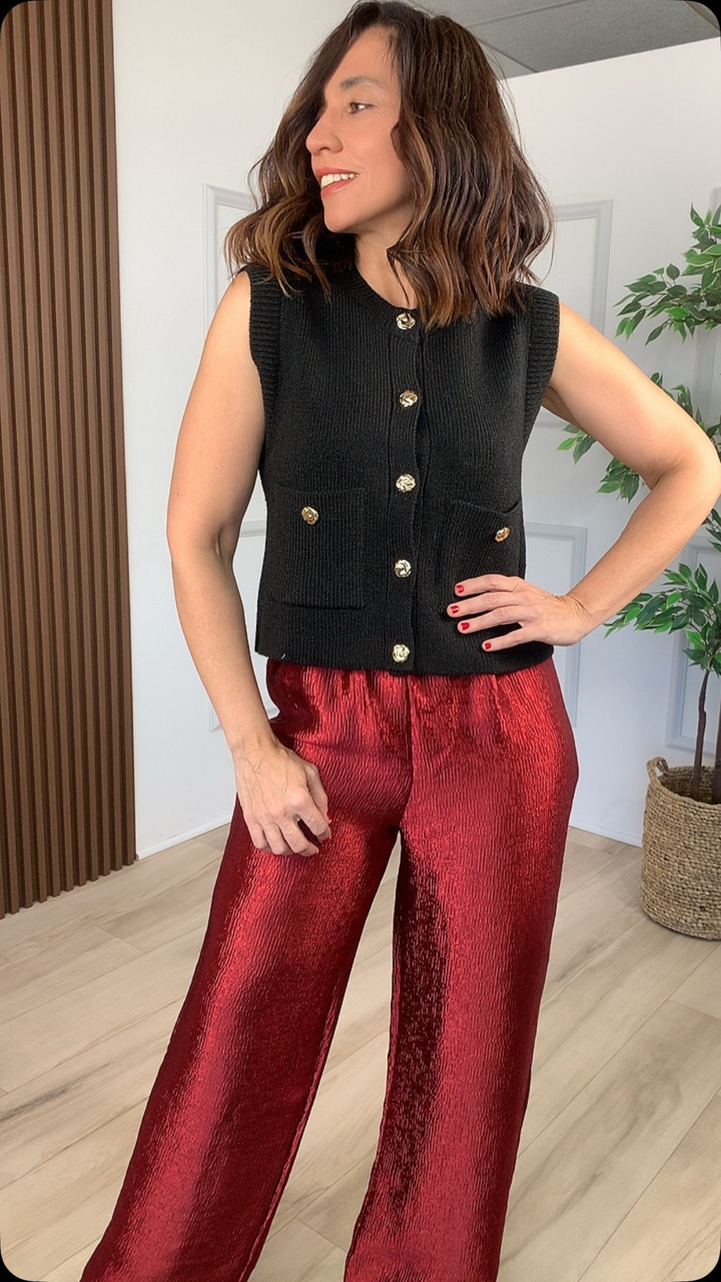 Elevate your everyday style with the Quietud Black Vest, a sophisticated piece that seamlessly transitions from casual to polished looks. This sleek waist-length vest features a classic button-up front paired with practical patch pockets—perfect for keeping essentials within reach while maintaining a streamlined silhouette. The soft knit construction offers comfortable wear throughout the day, while the timeless round neckline and sleeveless design provide endless layering possibilities. Whether you're dressing up a simple tee or adding dimension to a collared shirt, this versatile black vest delivers effortless sophistication. Its neutral tone pairs beautifully with virtually any outfit in your closet, making it an investment piece you'll reach for season after season. Transform your wardrobe with a vest that balances contemporary style with practical functionality.