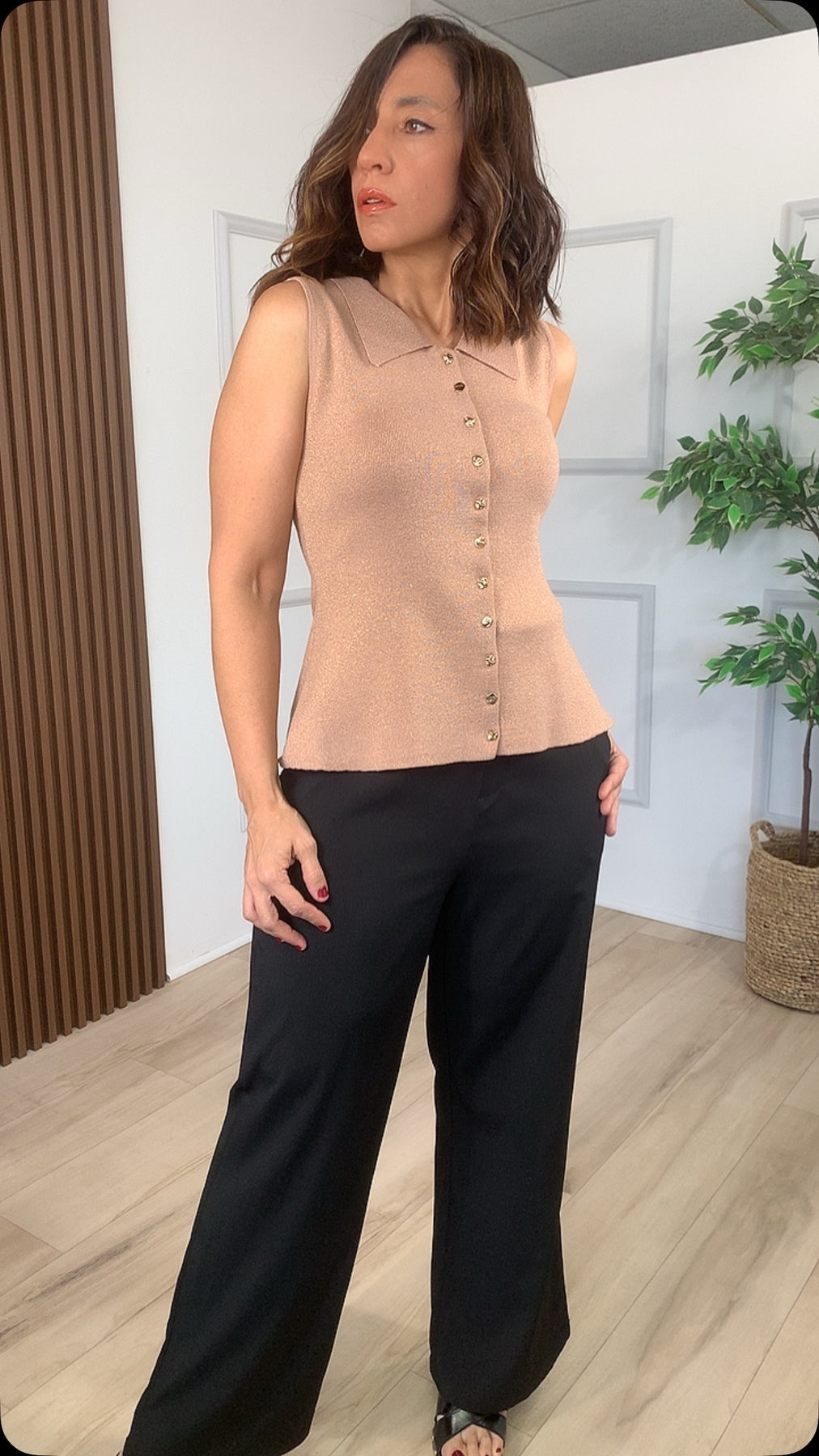 Renacer Black Pants combine elegant style with everyday comfort. The elasticized back waistband ensures a flexible fit that moves with you, while the front button closure and belt loops provide a classic, polished look. These high-rise pants sit perfectly at your natural waist, accentuating your figure with a tailored fit through the waist and hips. The wide-leg design gently loosens from the thighs downward, creating a graceful silhouette that flatters every body shape. Practical front pockets add convenience without sacrificing fashion, making these pants ideal for both professional settings and casual outings. Elevate your wardrobe with these versatile, chic pants designed for comfort and confidence.