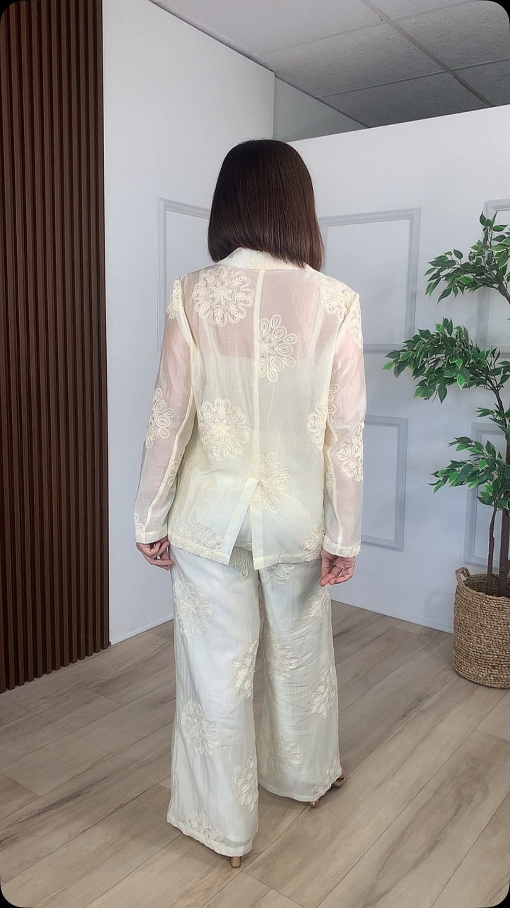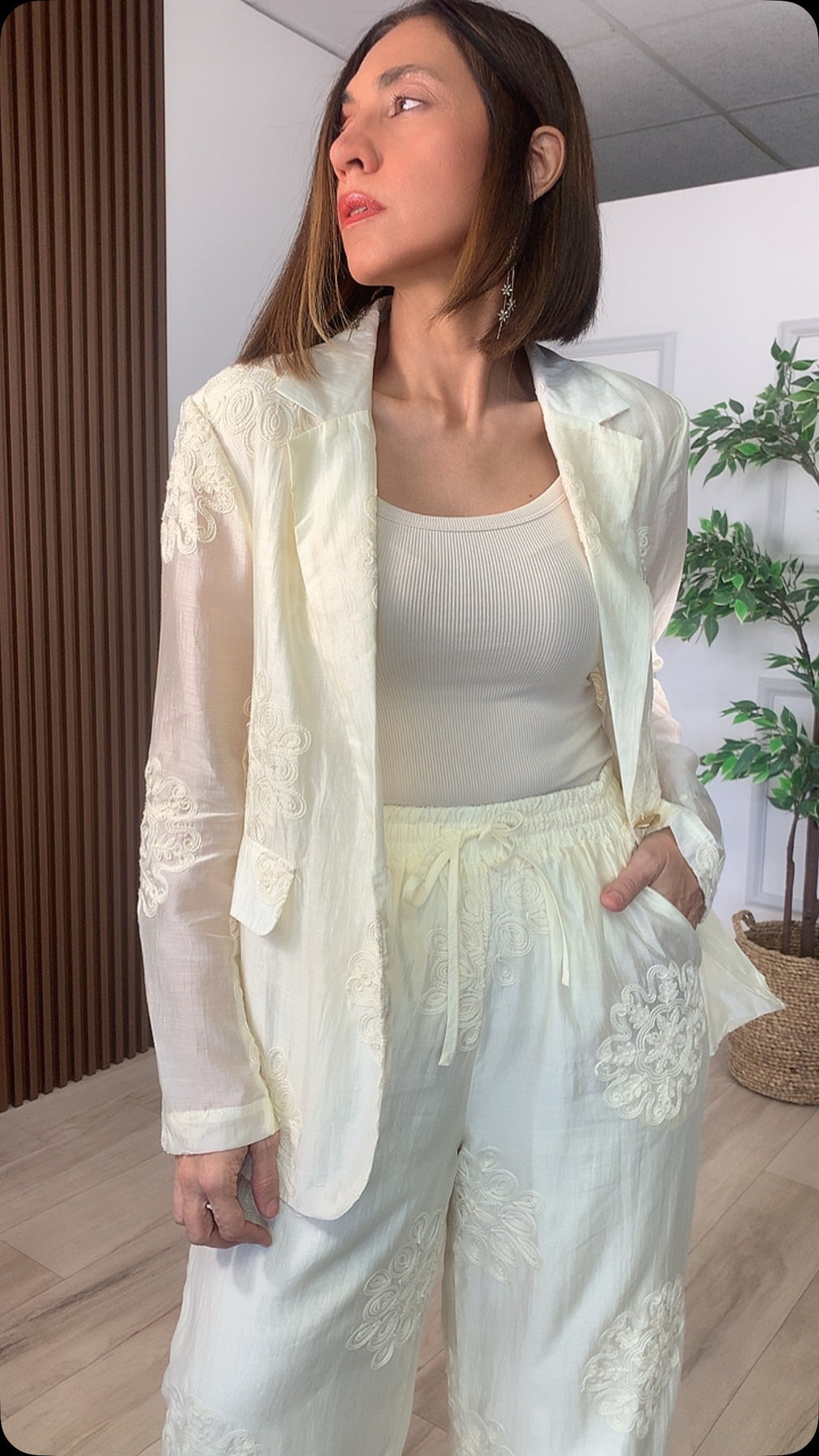Elevate your wardrobe with the Nuevos Comienzos Set, a refined ensemble featuring an ivory blazer and matching pants adorned with delicate embroidery. This sophisticated pairing effortlessly transitions from professional settings to upscale occasions, offering timeless elegance with intricate detailing that sets you apart. Perfect for those who appreciate understated luxury and impeccable craftsmanship.